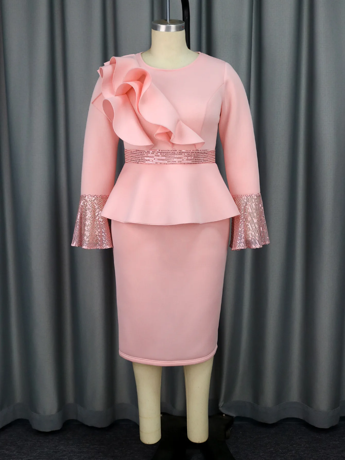 Custom Round Neck Flare Sleeve Dress Women Party Ruffle Sequins High Waist Dresses Casual Clothing Fashion Style Casual Dresses